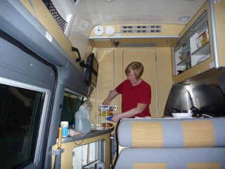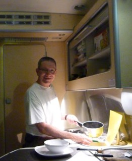 I made salads, brown rice, and tilapia filets for my first experience utilizing our little galley kitchen. It is compact but efficient with a good 2-burner propane cook top, sink, and surprisingly ample counter space.