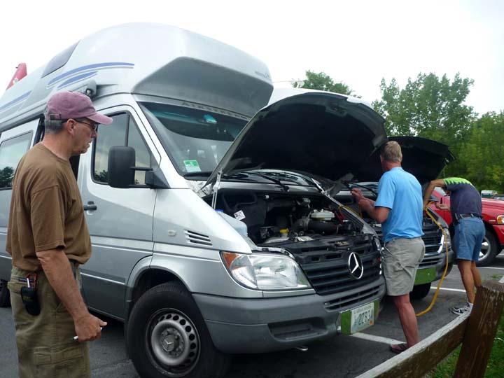 This “Start Error” had ocurred once before, so we were not immediately over concerned. We thought it would reset after 10 or 15 minutes. Unfortunately, our various attempts to fix the problem failed. I called AAA to find out that my towing coverage does not include RV’s. Al called Geico to be similarly disappointed, even though he was quite sure he had requested the additional RV towing coverage. We then called back to the WestyFest to see if any of the other owners knew how to handle this problem. Turns out none of them had ever seen this problem before, but three fellow Westy owners made the 45-minute drive over to see if they could help. They tried all the tricks they could think of. When none got haRVy started again, they diligently searched online with their smart phones. These efforts finally produced the winning combination of disconnecting the positive side of the battery while the ignition key was engaged. Somehow this reset the computer and we were able to restart the engine. Hurray!