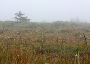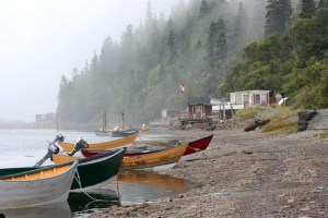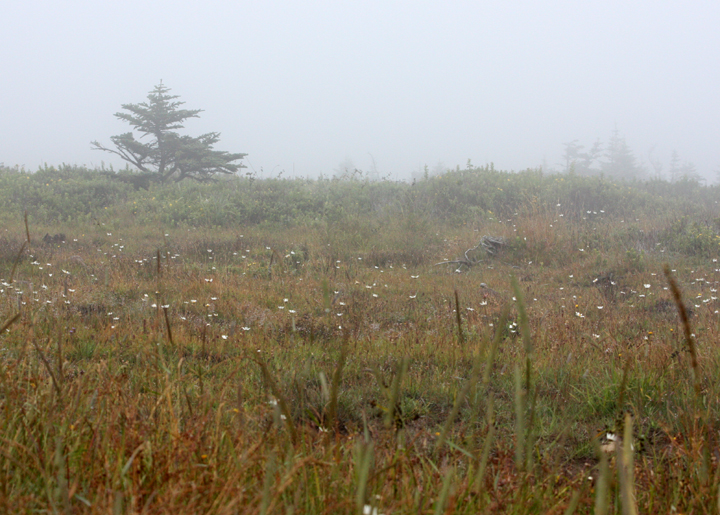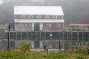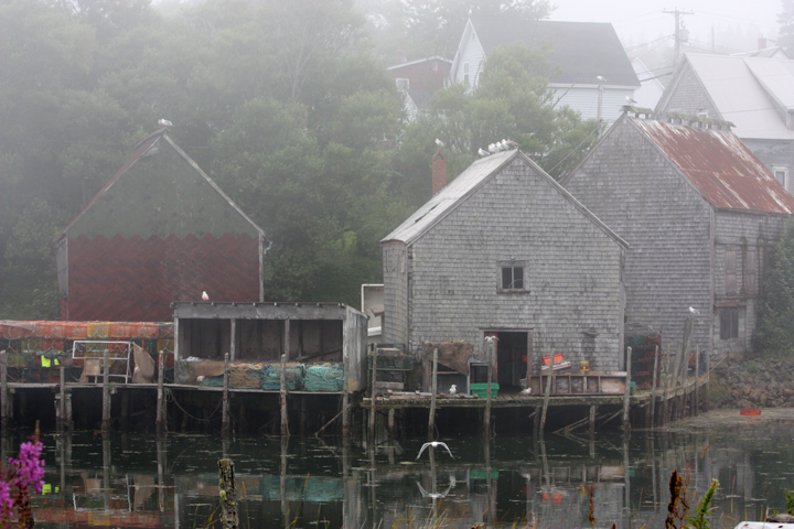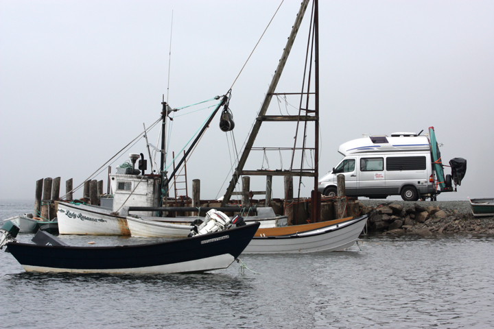 After lunch we took haRVy out to explore more of the island. We drove to the west side to see Dark Harbor, an apparent haven for the aforementioned dulse harvesting. The shoreline of the nearly fully enclosed bay was lined with locally designed and built skiffs. A tall natural breakwater, just visible in the distance was strewn with huge driftwood logs and what appeared to be occupied shacks. Can’t imagine what it is like to be out there when the waves are tossing all that stuff around and near your house. As the fog rolled in and out we snapped many photos.