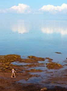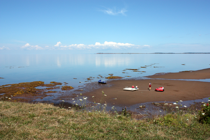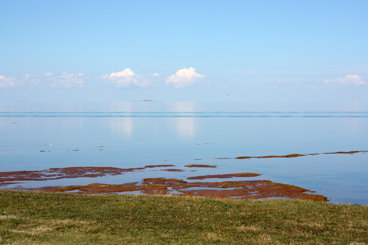 We looked for a picnic spot along our route and went a bit off the road to Brule Point where we witnessed an interesting phenomenon across the strait. The horizon actually seemed to drop off the edge of the earth with the puffy white clouds reflecting on the glassy surface. It was quite extraordinary. Photographs don’t really capture it, but we took dozens of shots to try anyway.