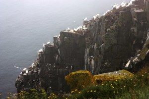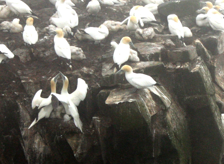 Literally thousands of nesting shorebirds including Northern Gannets, Murres, Kittiwakes, Razorbills, and Guillemots reside on the rock, plus nearby ledges, outcrops, overhangs and plateaus. We were able to proceed to within 50 feet of some of the colonies. It was quite spectacular (and noisy!).