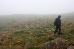 We didn’t need to be in St. John’s until dinner time, so we took the very long way around the Avalon Peninsula “Shore Road” to visit Cape St. Mary’s Ecological Reserve at the southern tip. A sign stating, “Narrow Road 13 km” greeted us at the turnoff from the “highway.” Towards the end of that drive the fog got so thick that we couldn’t see the interpretive center just a couple hundred feet from the parking lot. We donned our rain gear for the one mile hike along the cliffs to “bird rock” where all our efforts were richly rewarded.