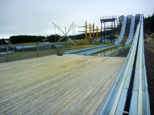 I took a walk around this campground this morning and learned from the owner’s mother that it had been a Provincial Park until 13 years ago when the government sold it to an enterprising young man who has been improving the camping facility while adding a water park. He has bought several used water slides and pools and is setting them up near the lake shore. It seems incongruous to me in this beautiful natural setting, but he says it’s popular with the seasonal campers as well as day visitors.