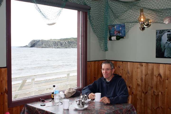 We went out to lunch (!) at the very nice (even by US standards) Seaside Restaurant in the town of Trout River, which leaves a lot to be desired as it is quite depressed even though it is in a lovely setting where a flowing river meets the sea at a crescent beach with a boardwalk from end to end. Several of the women in Trout River proudly display and sell their knitted goods from lines in front of their house and Al decided to buy a pair as he needed thick ones to wear inside his Bean boots.