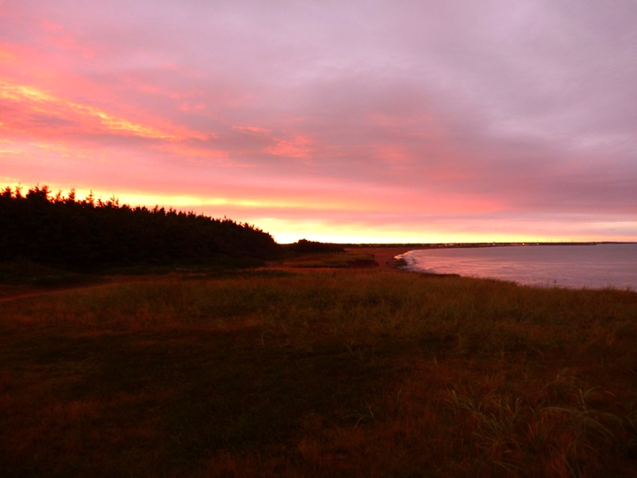 We arrived at our Rhode Island friend Jim O’Connor’s property at Tignish Shore at 5 and got ourselves positioned to hunker-down for a day or two as the storm comes through. It is rainy and windy, but the temperature is still pleasant today. After dinner the rain and sky cleared (temporarily) and we got out to observe a colorful sunset and rainbow over the ocean. We are both looking forward to more explorations as the weather permits.