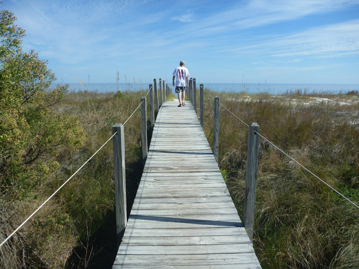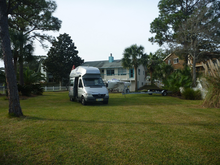 During these short days it’s not long after lunch that we have to start planning where we will spend the night. St. George Island looked interesting on the map, so we decided to check it out. While the island did not prove terribly captivating (except for the beautiful white sand beach that ran the length of it), Al decided to try boondocking on an empty house lot directly on the Gulf waterfront. I never thought we’d get away with it for an overnight, but agreed to park long enough for another beach walk and dinner aboard. When nobody paid us any mind, we decided to stay put. We even got to watch a pod of dolphins frolicking a few yards offshore. This spot ranks right up there with some of the best real estate we’ve camped on for FREE!