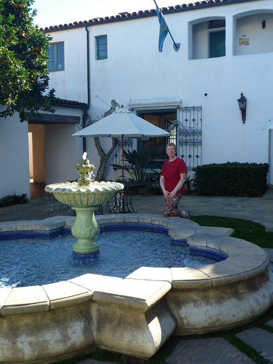 The following photograph had to be taken because our family photo album includes one of my sister and mother at this same spot in 1945. One of the great pleasures of Santa Barbara is getting to tour restored historic properties, many of which are still in use. El Paseo, California’s first shopping center, was built in the 1920s and today features a variety of unique  gift shops, jewelry stores, galleries, restaurants, and offices nestled amid romantic gardens and Spanish courtyards.