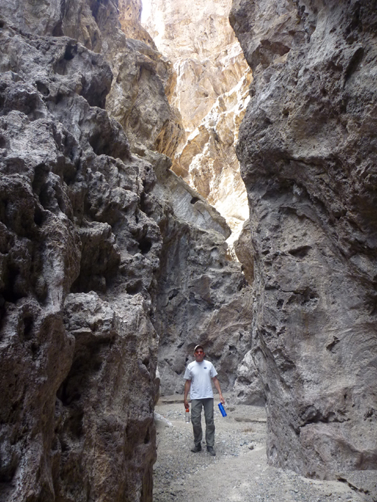 The next day we took an extraordinary hike in an unexpectedly interesting canyon area adjacent to the date farm. We hiked down a long, wide canyon that contained interesting artifacts, up and over a mesa, across the Amaragosa River, over an historic railroad bed, and into a really cool (literally, as it provided much needed shade) slot canyon.