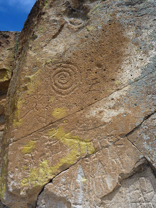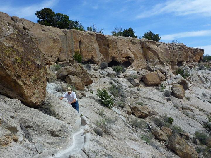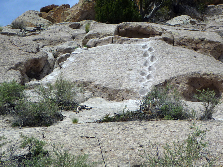 Tsankawi (pronounced sank-ah-WEE), a separate section of Bandelier National Monument about 11 miles north of the main entrance, offers an amazing 1.5 mile loop hike on a more primitive trail. Here we walked in the pathways worn by the bare feet of ancient Puebloan inhabitants. Our surroundings included the remains of a large un-excavated village, cave dwellings, and many petroglyphs (drawings carved in rock).