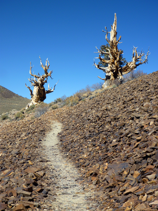 The trees of the Ancient Bristlecone Pine Forest are the oldest recorded living things on earth. A millennium older than the Giant Sequoia trees in the nearby Sierra, many are well over 2,000 years old and at least one has been dated at over 5,000! These trees were young and growing at the time stone axes were being used in Europe and the Great Pyramid of Khufu (Cheops) was being built.