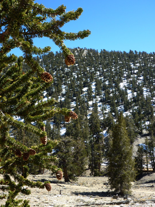 Bristlecone pines (Pinus longaeva & aristata) grow at elevations of 9,000 to over 11,000 feet. The oldest trees grow on outcrops of dolomite, an alkaline calcareous, low nutrient soil. Only on the alkaline dolomite will you find pure, relatively dense stands of bristlecone pine.