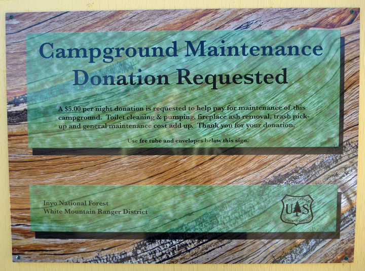 Here’s a sign we’d like to see at more campgrounds (Donation $5 per night). This was the first we’d observed. It would be great to pay what you feel a campsite is worth, as many are drastically overpriced.