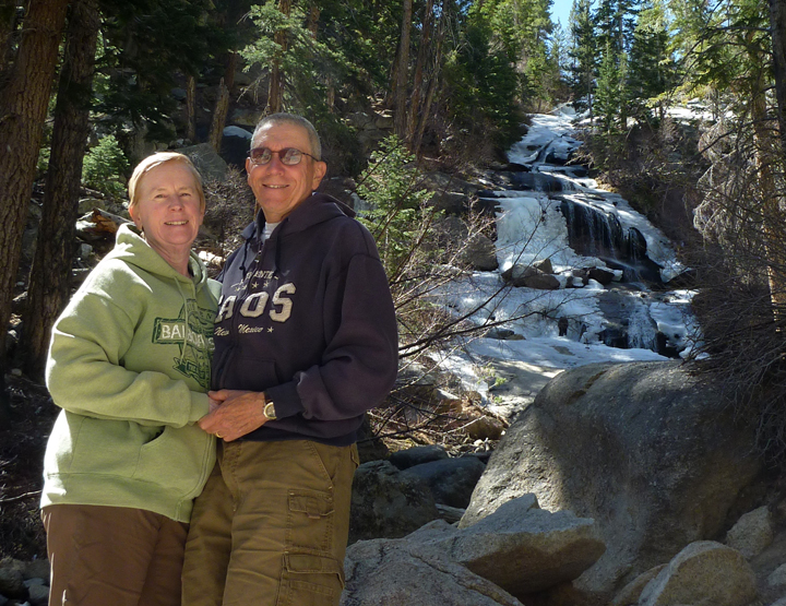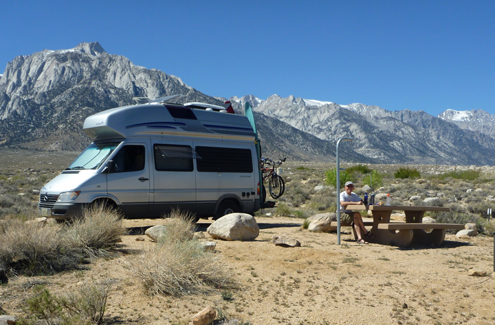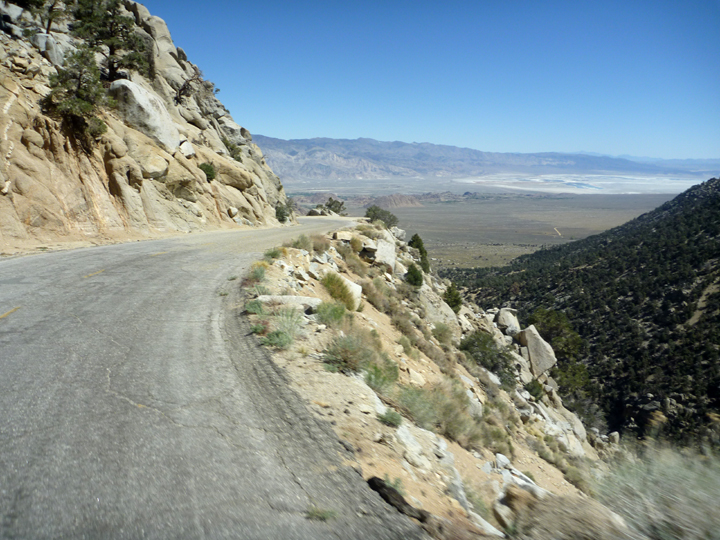 A dramatic change of scenery and temperature greeted us at the end of the Whitney-Portal Road, a short but spectacular drive that takes you about halfway up Mount Whitney. I’m not sure it deserves its listing on dangerousroads.org, but the 13-mile road is narrow, steep and winding, with dramatic switchbacks. The road has a film history, too. The steep, sharp switchbacks were prominent in scenes in the Lucille Ball and Desi Arnaz film The Long, Long Trailer, in which Luci surreptitiously fills a travel trailer with her rock collection until it’s too heavy to ascend the grade. The road is also featured in the 1941 classic, High Sierra, starring Humphrey Bogart. HaRVy had no trouble ascending, but the descent was pretty tough on his brakes.