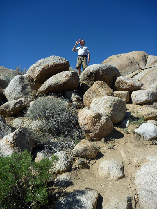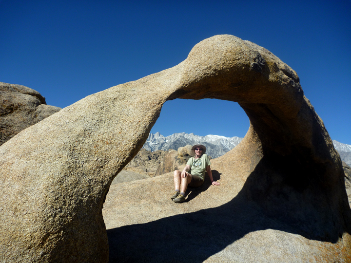 Before the heat set-in the next morning, we took the Mobius Arch hike in the nearby Alabama Hills. The rounded contours of the Alabamas contrast with the sharp ridges of the Sierra Nevada to the west even though they are the same age. The difference in wear can be accounted for by different patterns of erosion.