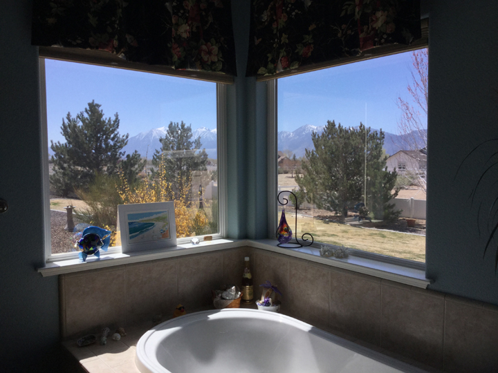 We are taking some time off here to get caught up on various projects and business. Some of these tasks can be difficult while always on the move. I am also working on getting rid of a bad cold. Nicer to do that with a home-base than in campgrounds. The view from their tub (below) isn’t quite as good as the one from the hot springs in my previous post, but it will certainly suffice.