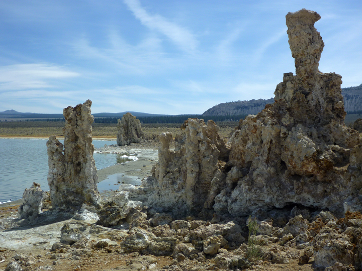 Our last stop of interest was at Mono Lake (below), a large, shallow saline soda lake formed at least 760,000 years ago. Currently, the primary draw for tourists are the ” tufa towers,” calcium-carbonate spires and knobs formed by interaction of freshwater springs and alkaline lake water.
