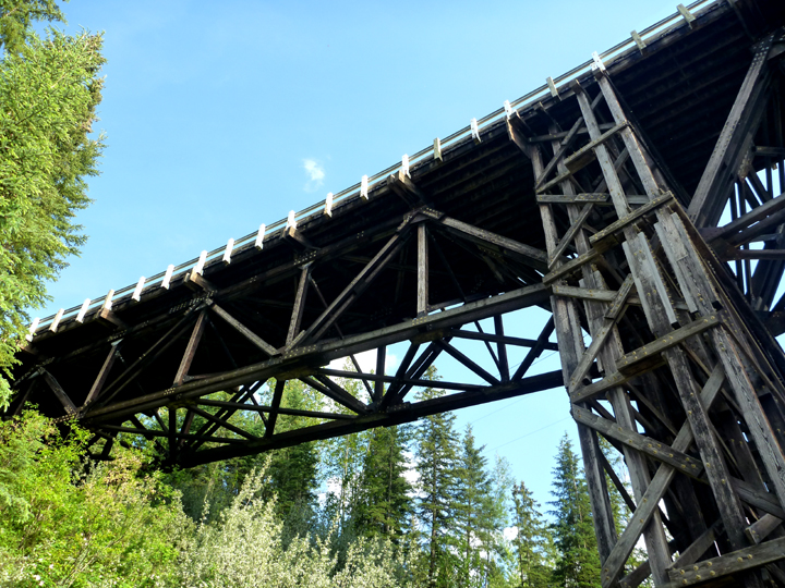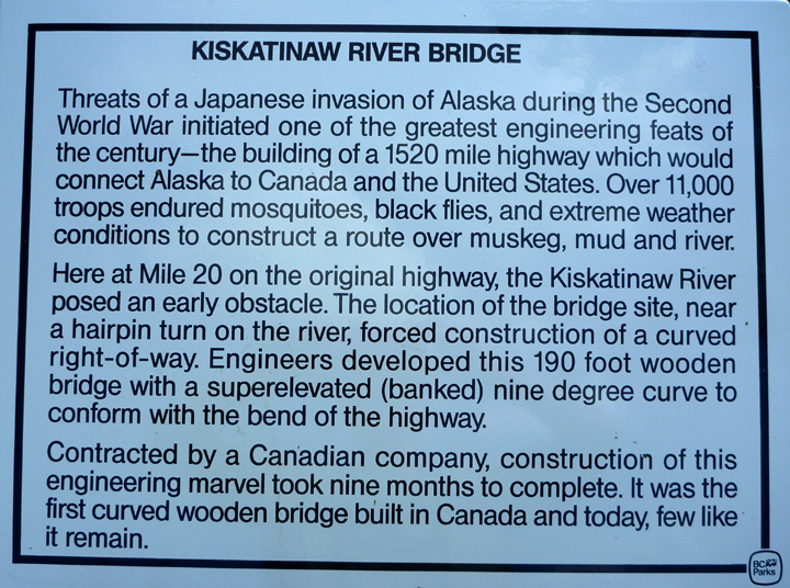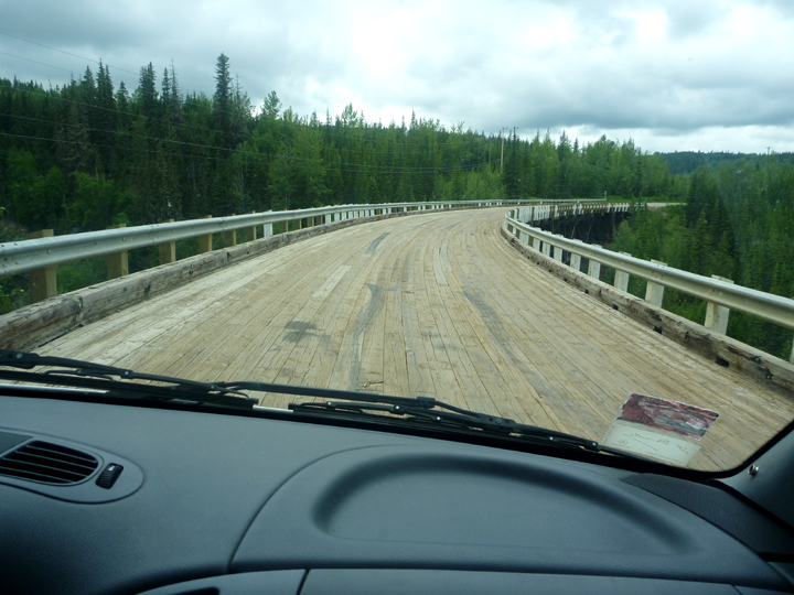 Our first day on the highway only got us 17 miles out of Dawson Creek, but that’s because we wanted to experience a bit of the original highway where the only original timber bridge is still in use. The Kiskatinaw is a three span, timber truss structure built 30 metres (100 feet) above the stream. We hiked below it to view the details.