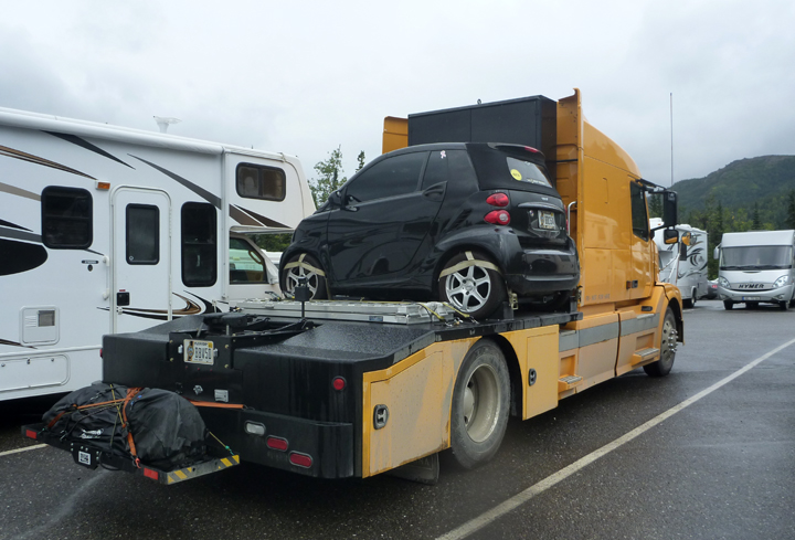 Wonder how he gets the car down from there. And, just how big is the 5th wheel trailer he tows with that rig?