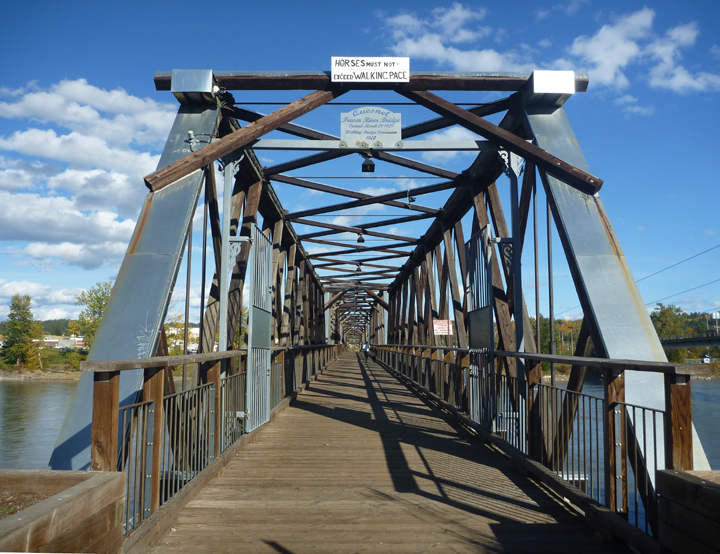 In Quesnel (pronounced Kwe-NEL), we walked across the “World’s Longest” wooden truss pedestrian bridge.
