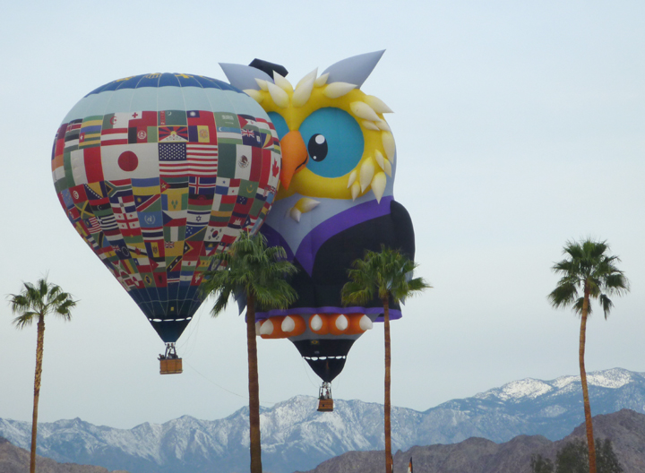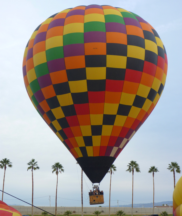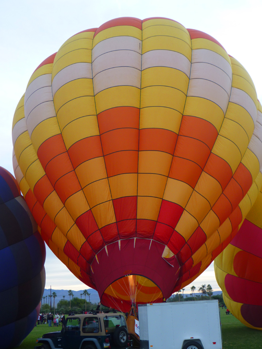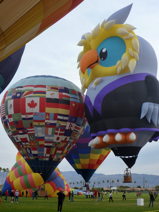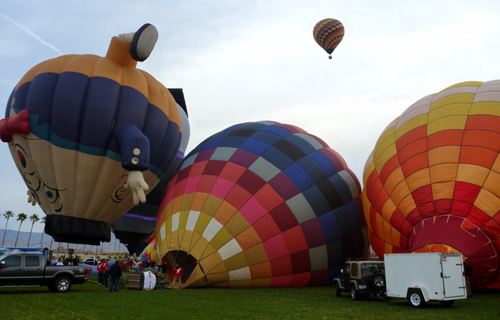 The Empire Polo Club, located just over a mile from where we are staying at our friend MaryEllen’s place in Indio, CA, hosted 20 hot air balloons during festival last weekend. We got up at the crack of dawn to watch them inflate and take off. The access was incredible and the price right…free! It was great fun.