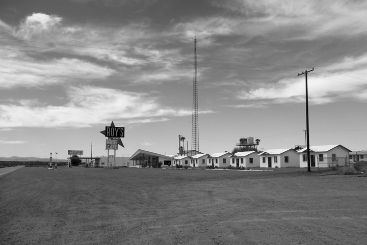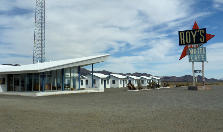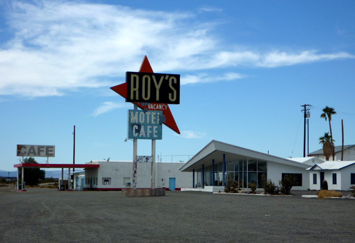 Roy’s Motel and Café, which prospered due to its isolated location on Route 66, opened in 1938. It prospered until the Interstate 40 bypassed Amboy in 1973. It was purchased by Albert Okura in 2005, who offered $425,000 in cash and promised to preserve the town and reopen Roy’s. The deal included about 490 acres, including the church, post office, three gas pumps, two dirt airstrips and other buildings in the town. Today the motel is used as a stage for art exhibits and there is a rather uninspired gift shop in the cafe. The lack of an adequate potable water supply prevents further development.