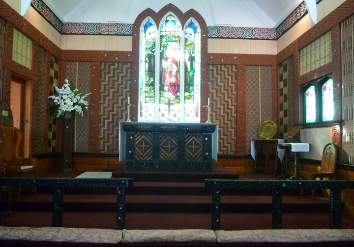 Maori woven flax matting (tukutuku) and hand painted scrollwork on walls and altar.