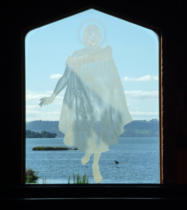 Etched image of Christ wearing a Maori cloak as he appears to walk on the waters of Lake Rotorua.