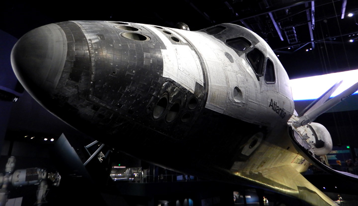 A life size mock-up of the fuel tank and booster rockets that launched the shuttles.