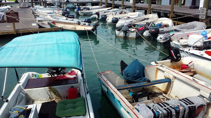 Lots of dinghies at the dock from cruising boats moored offshore.