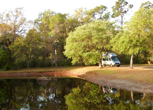 Boondocking next to the pond at RV Golf Club host The Preserves at Turnbull Creek in New Smyrna Beach.