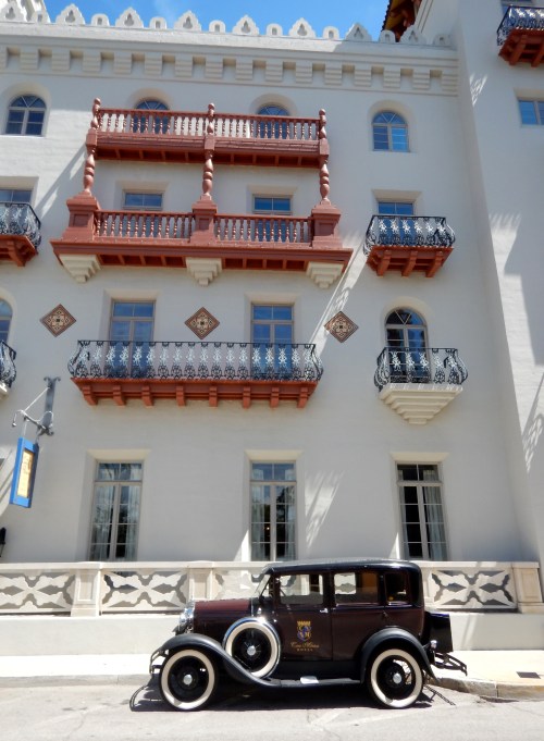 Classic car in front of the majestic Spanish style Casa Monica, which was built in 1888 and restored in 1999.