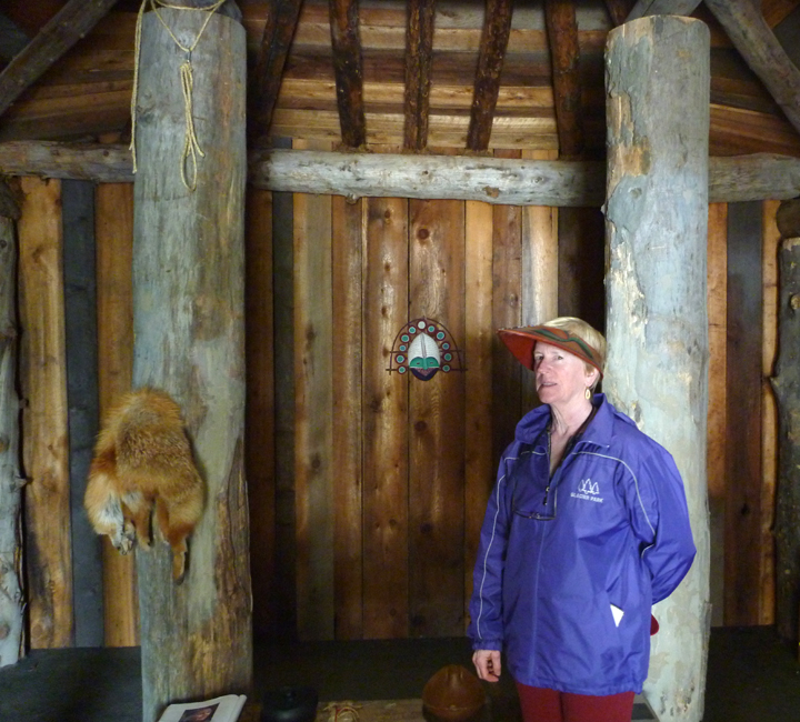 Trying on a traditional hunting visor in a re-created Unangax dwelling.