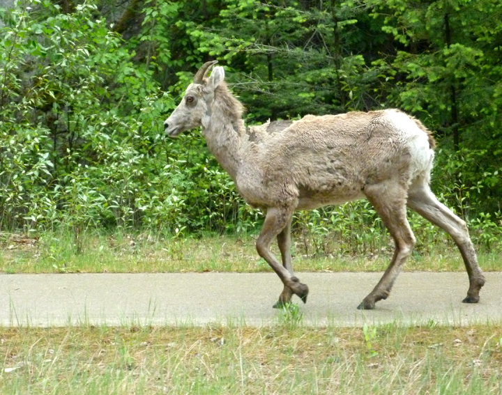 Internet access has not been available when I’ve had time to blog, so I’ll have to do some catching up here. We have seen and done a lot since my last posting. After our paddle excursion we proceeded to the town of Radium Hot Springs, British Columbia where our muscles really appreciated the hot springs pool. The village’s unofficial mascots are members of a resident herd of Rocky Mountain bighorn sheep.