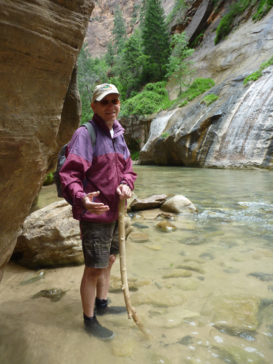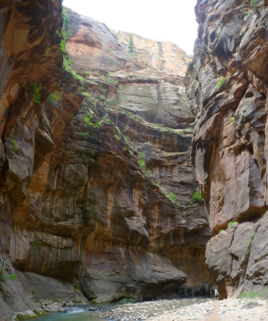 The Virgin River has carved a spectacular gorge in the upper reaches of Zion Canyon – 16 miles long, up to 2,000-feet deep, and at times only 20 to 30-feet wide. A section of this gorge, referred to as The Narrows, displays soaring walls, sandstone grottos, natural springs, and hanging gardens. Our hike, a few miles up and back, much of which was actually in the river (hiking stick and kayak boots mandatory), proved spectacular and refreshing, as the temperature in the tall, narrow gorge was 15 to 20 degrees cooler than down in the canyon proper.
