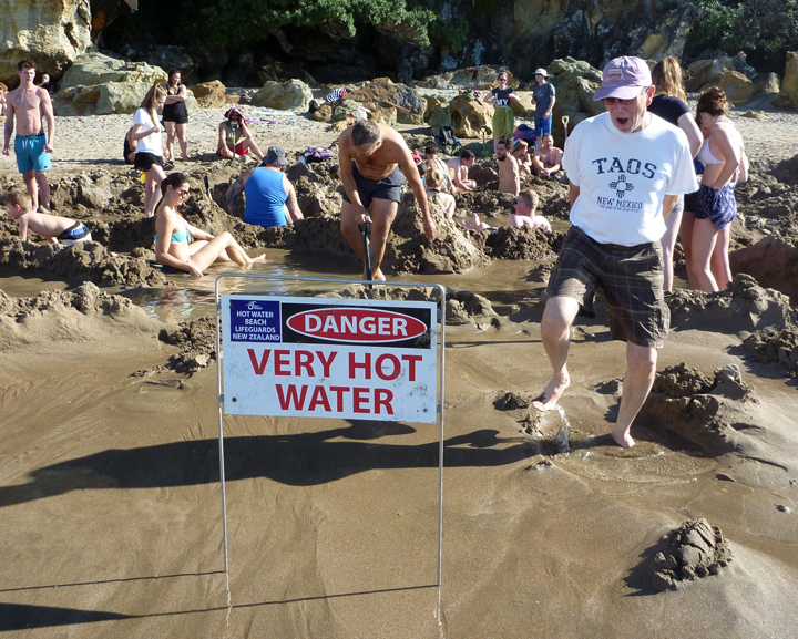 One of the must-see sights on the Coromandel is Hot Water Beach where underground geothermal fissures create boiling hot water that bubbles through the golden sand at low tide. Visitors dig their own spa pool in the sand and relax in the natural springs… a truly unique Kiwi experience. It all sounded a bit silly to us, but we went anyway.