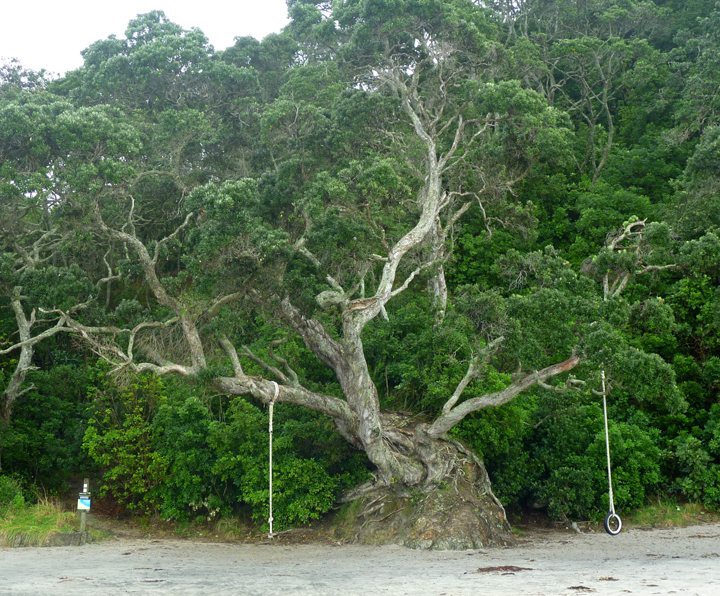 Kiwi swing-set on a Pohutukawa tree.